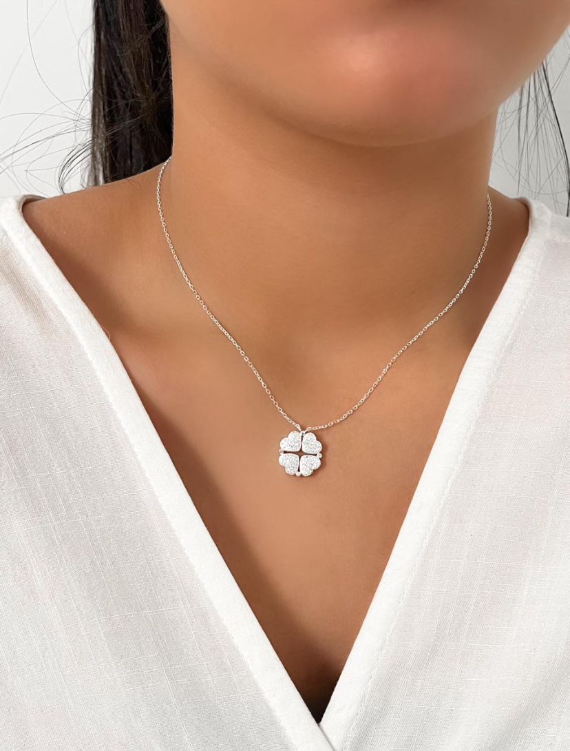 Colar delicado! que une a beleza e um design exclusivo. O pingente de trevo/coração cravejado, trazendo brilho e elegancia. Uma abertura sutil no meio do pingente revela detalhes únicos, destacando sua originalidade. A corrente delicada no estilo veneziana complementa o conjunto, garantindo conforto e sofisticação. Perfeito para quem valoriza peças exclusivas e acabamento impecável em prata de alta qualidade.
